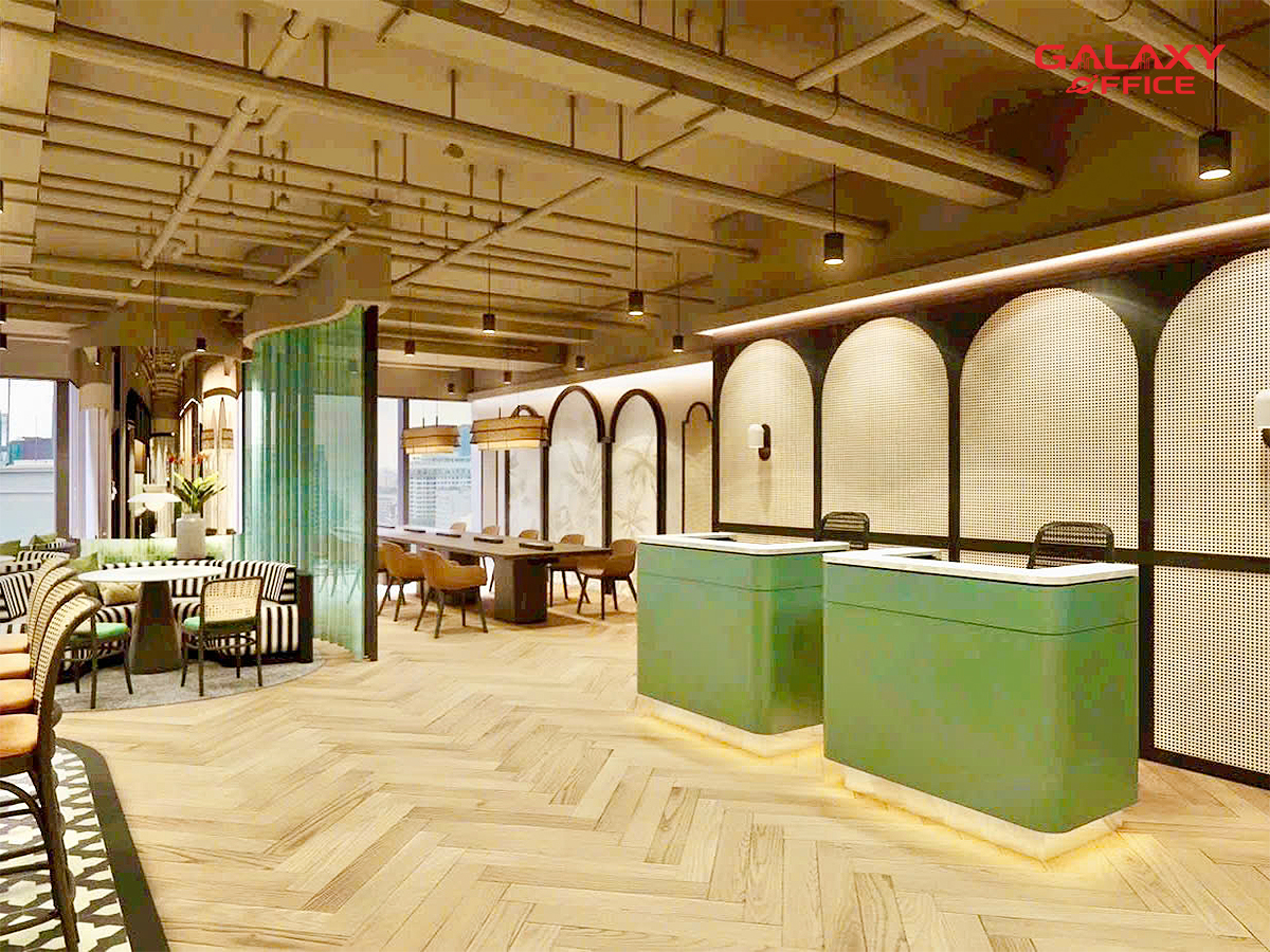 Không gian tại JustCo Riverfront được thiết theo phong cách vừa hiện đại vừa cổ điển, tận dụng ánh sáng tự nhiên, vật liệu thân thiện môi trường, trần cao thoáng đãng.